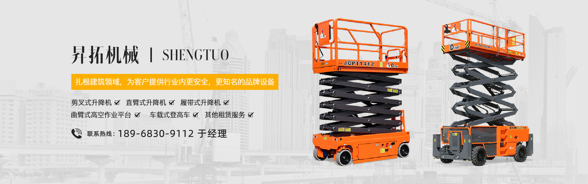 寧波昇拓機械租賃有限公司是一家建筑領域的高空作業車,升降機作為公司的主打租賃產品,為客戶提供行業內更安全,更知名的品牌設備,其高度范圍從6米----43米多層次不同機型,擁有專業的設備維護團隊和備件庫,您只管放心使用設備,保養維修我們來做。